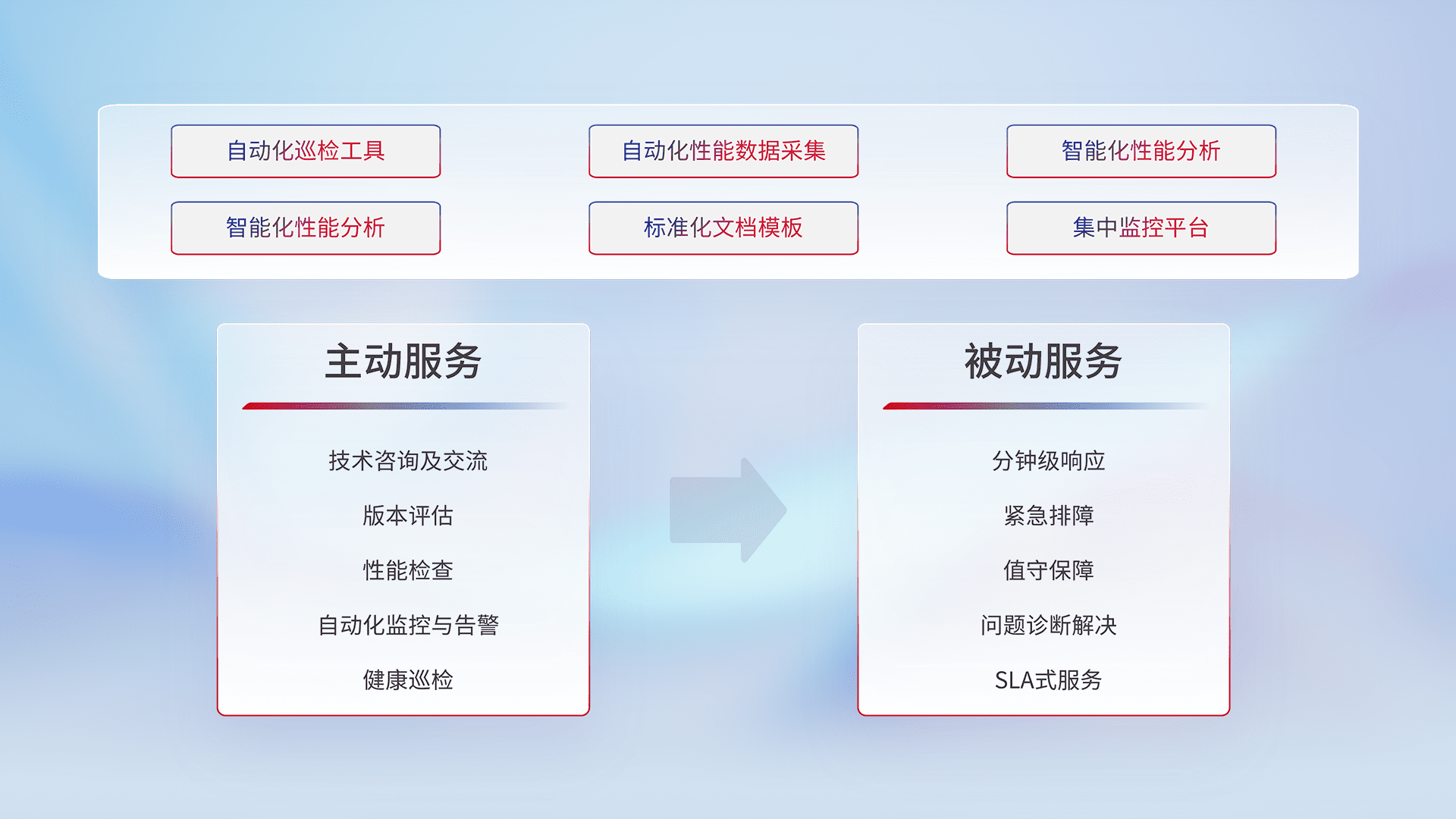 智能化工具和标准化文档,,,,保障服务质量,,,,提供主动服务(包含技术咨询、、、、版本评估、、性能检查、、、、自动化监控与告警、、健康巡检)和被动服务包含(分钟级响应、、、、紧急排障、、、值守保障、、问题诊断解决、、、、SLA服务)。。。。