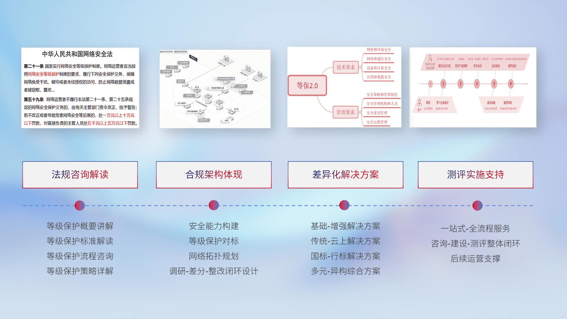 通过专业的法律咨询解读、、、、合规架构体现、、、、差异化解决方案、、测试实施支持等服务,,,,为客户量身打造等保合规体系。。。。